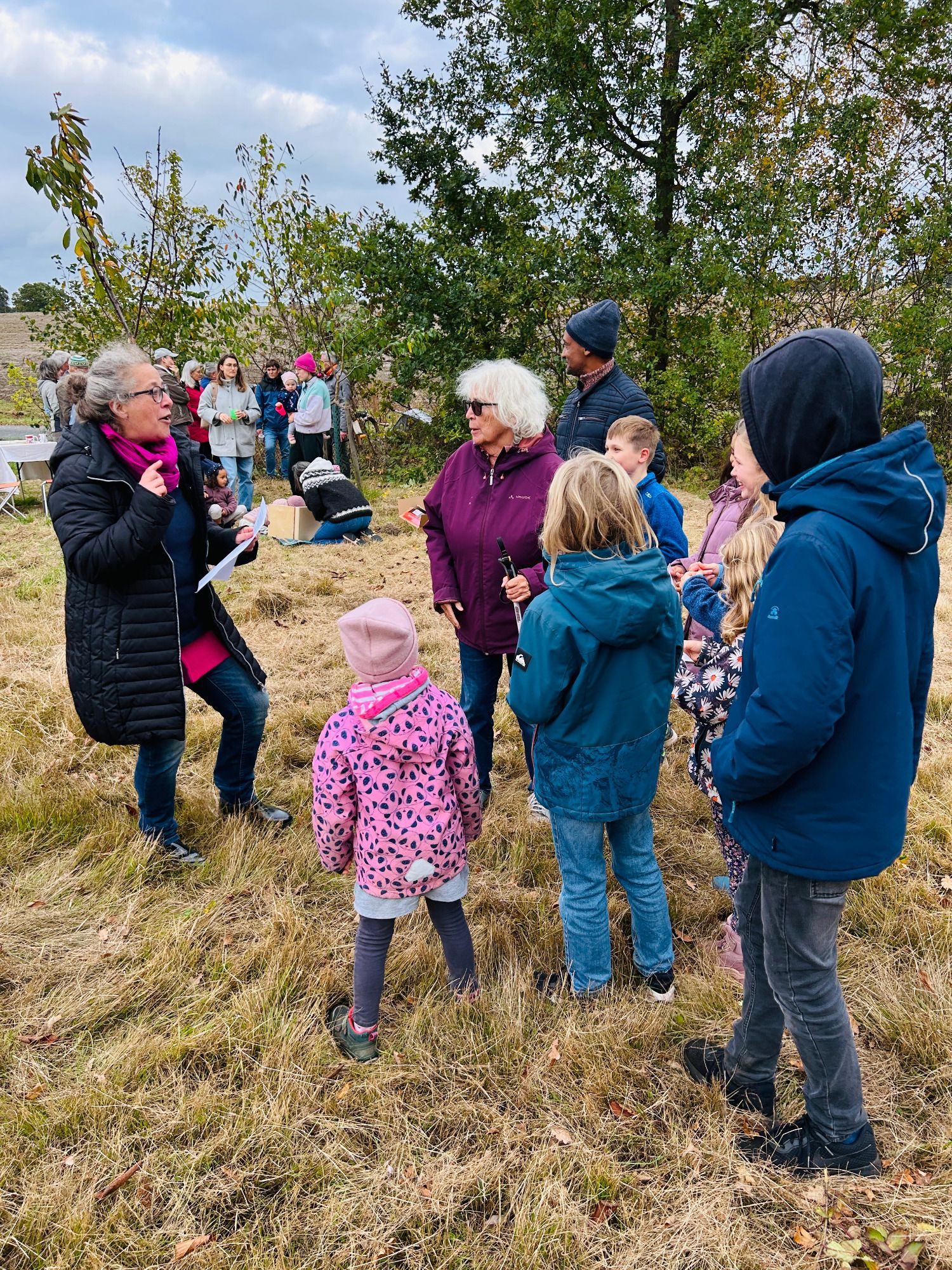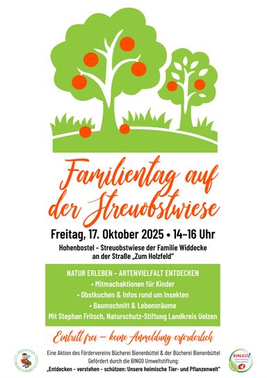 Der Tag auf der Streuobstwiese der Familie Widdeke am 17. Oktober bildete den Abschluss der Veranstaltungsreihe "Entdecken – Verstehen – Schützen". Gemeinsam mit der Bücherei Bienenbüttel und erneut mit Unterstützung der BINGO-Stiftung gestalteten wir für Jung und Alt einen abwechslungsreichen Nachmittag. Herr Fritsch, Geschäftsführer der Naturschutzstiftung des Landkreises Uelzen, erzählte spannende Infos zur Bedeutung der Streuobstwiesen und gab anschliessen Tipps zum Obstbaumschnitt. Die Kleinen vergnügten sich bei Rätselraten und Erzähltheater und zum Stillen des kleinen Hungers standen zahlreiche Obstkuchen und eine bunte Auswahl von Apfelsorten bereit.